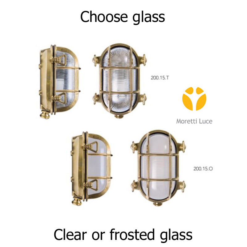 Oval skotlampe i massivt ubehandlet messing eller forskellige overfladebehandlinger.  Vælg mat eller klart glas.