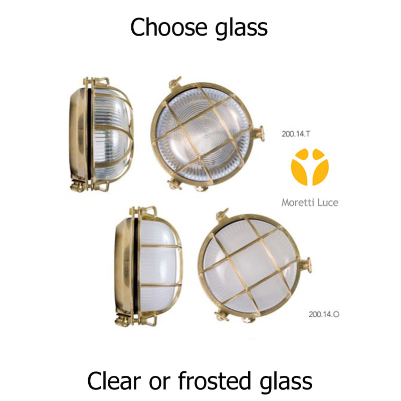 Rund skotlampe i forniklet massivt messing.  Vælg mat eller klart glas.