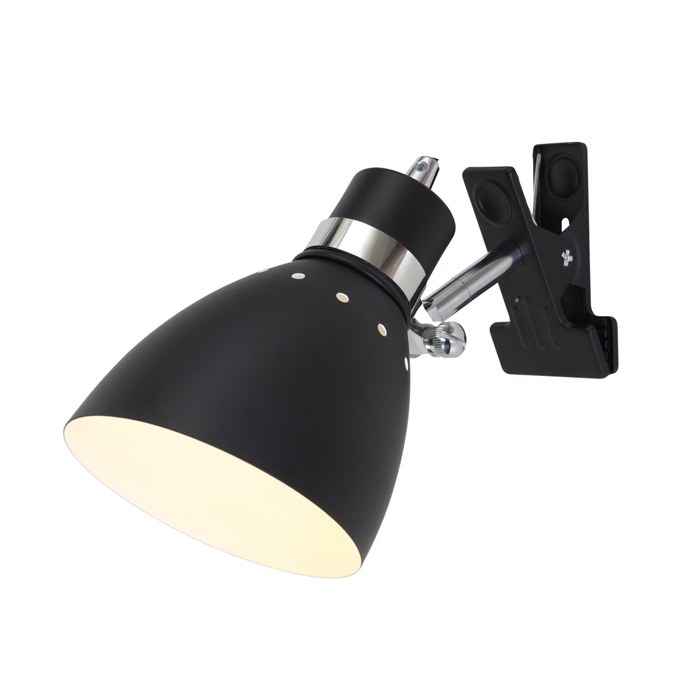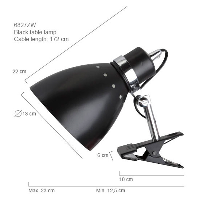 Lampen er sort med krom detaljer og har en stærk klemme på 10 x 6 cm, der kan gribe over max. 4 cm