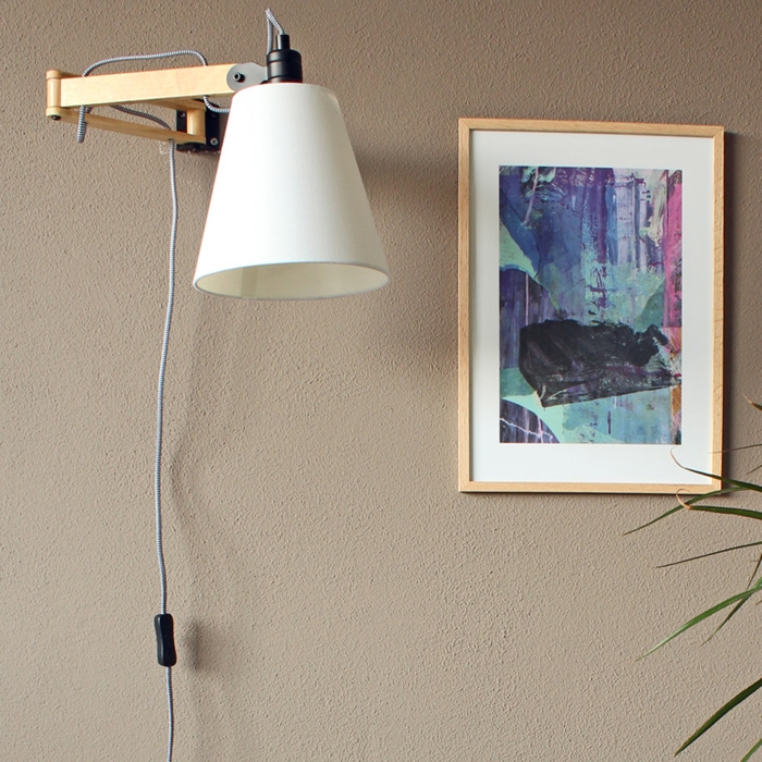 Smart væglampe i lyst træ og sortlakeret metal med tekstilskærm.