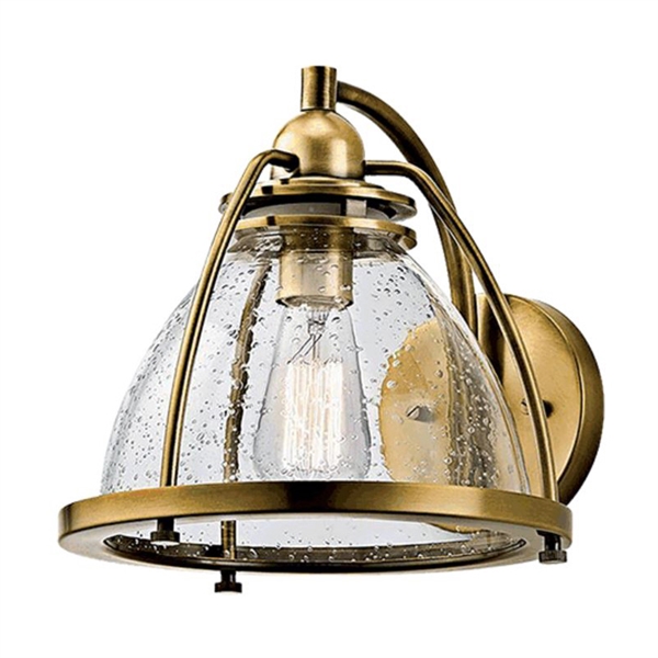 Fin væglampe i metal lakeret som antikmessing og med mundblæst glas med fine bobler i glasset.