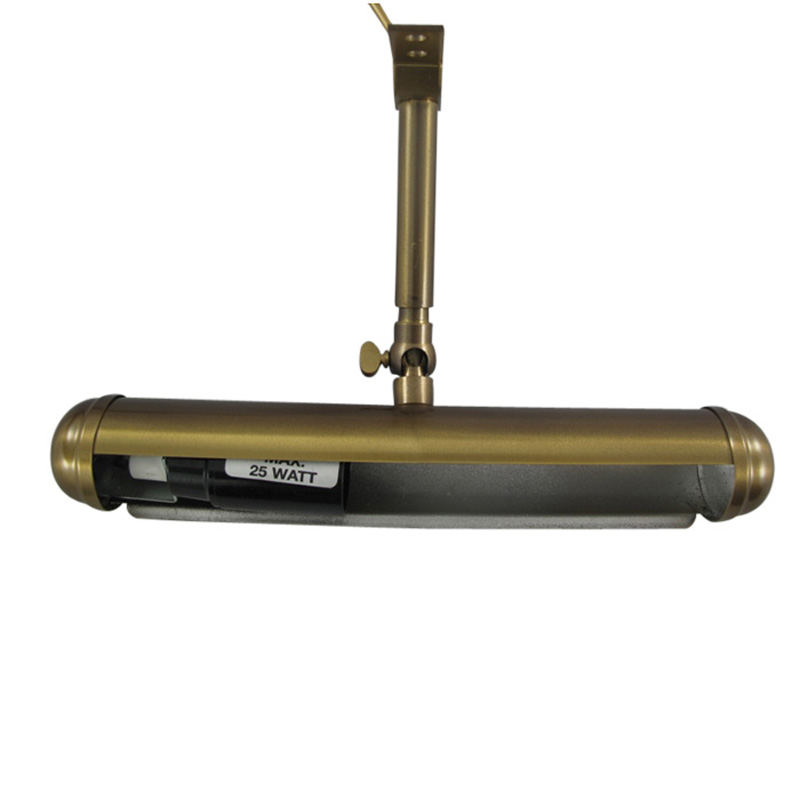 Klassisk gallerilampe i antik messing, der passer smukt over malerier eller andet dekorativt på væggen.