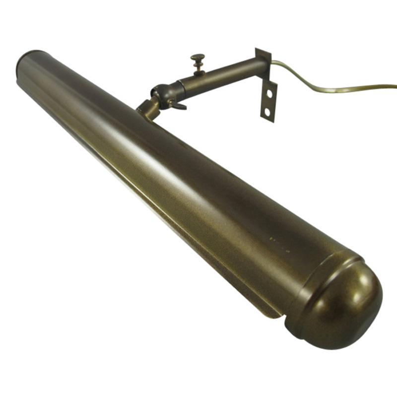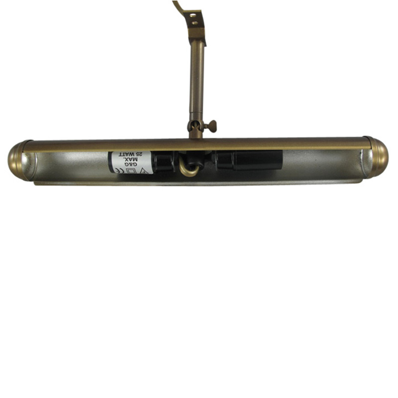 Klassisk gallerilampe i antik messinglakering, der passer smukt over malerier eller andet dekorativt på væggen.